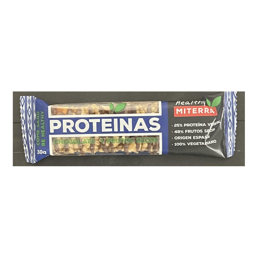 Barrita proteica elaborada con chocolate y frutos secos, pensada como snack energético con aporte de proteínas y carbohidratos para consumir en cualquier momento del día.