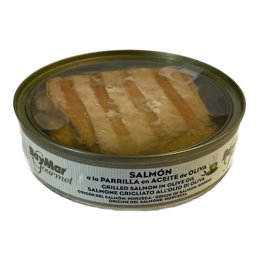 Filetes de salmón a la parrilla en aceite de oliva. Salmón 68%, aceite de oliva 31%, sal 1%. Formato RO-160. Origen: Noruega.