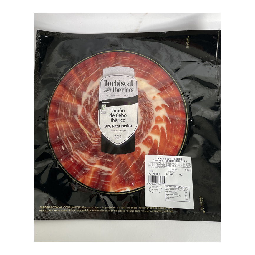 Sobre de jamón ibérico cortado a cuchillo. Marca Torbiscal. Presentación sobre de 100gr. Unidades por caja: 20.